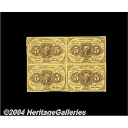 Fr. 1230 5c First Issue Block of Four Choice About New. A nice bright "20 cent" piece with good original surfaces and only minor handling that separates these notes from the Gem New grade. Pretty and scarce. <BR><BR><B>Important notice:</B> Heritage usually auctions material at the rate of 200-250 lots per hour. On some occasions eBay Live bid software or the Internet may not be able to keep up with the pace of the auction. We recommend placing a realistic absentee bid now as insurance to avoid disappointment. Occasionally the auctioneer may eliminate or reject an eBay Live bid, and the auctioneer may also reopen a lot after the close of the eBay live bidding (usually because we missed an audience bid), and may reject your bid even if it shows you as the winning bidder. By bidding via eBay Live, you agree that Heritage may award the lot to another bidder at its sole discretion under the circumstances described above or any other reasonable circumstances. Since eBay bids are not shown to us until we open the lot on the floor, we treat those bids just like floor bids. In most cases the floor responds before the eBay bid is presented to us, due to Internet lag time, so for consistency we have made it a policy that floor bids are always considered first over tie eBay live bids. Also please note that all Heritage lots purchased through eBay Live carry a 20% Buyer's Premium. Please make sure you read the Terms and Conditions before you bid. <BR><BR><B>IMPORTANT ANNOUNCEMENT ABOUT RESERVES:</B> Heritage now divulges all reserves on its web site 7 days before every auction. If you want to know whether the reserve on this lot has been met, and if not, what the reserve amount is, please visit this lot page on the HeritageCoin.com web site, or email: bid@HeritageGalleries.com