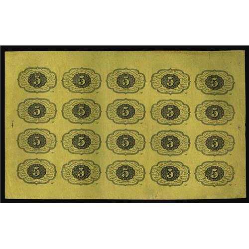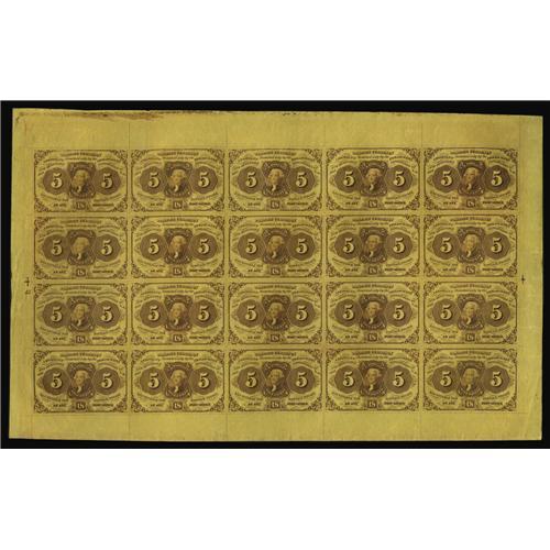 <B>Fr. 1230 5c First Issue Complete Sheet of Twenty New.</B></I> A bit too handled for the Choice grade with a few light bends through the center. Individually, many of the twenty notes are full <B>Gems,</B></I> and none are worse than <B>Choice AU.</B></I> The margins are huge all around and the colors are bright and as-made. A most attractive sheet.