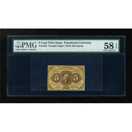 <B>Fr. 1230 5c First Issue PMG Choice About Unc 58 EPQ.</B></I> A light fold can be seen on this deeply inked note.<BR><BR><b>Shipping:</b> Coins & Currency (<a target="_blank" href="http://www.heritageauctions.com/common/shipping.php">view shipping information</a>)