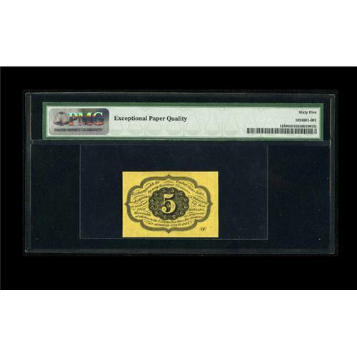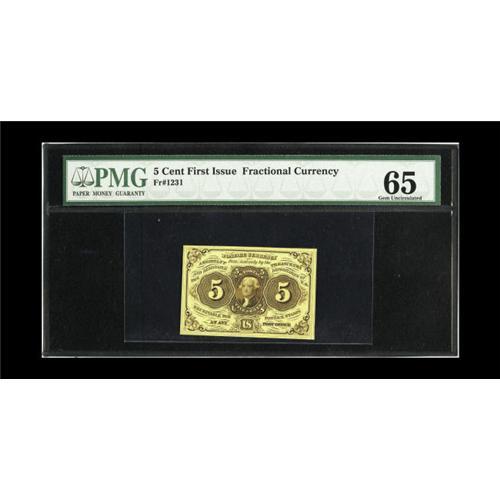 <B>Fr. 1231 5c First Issue PMG Gem Uncirculated 65.</B></I> The attractive color of this First Issue 5¢ is framed by far larger and more well balanced margins than typical for this issue.