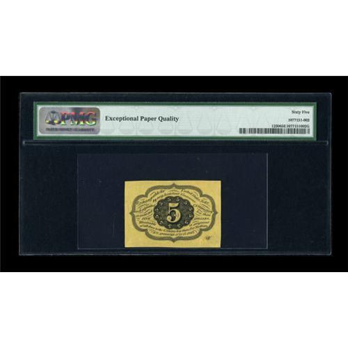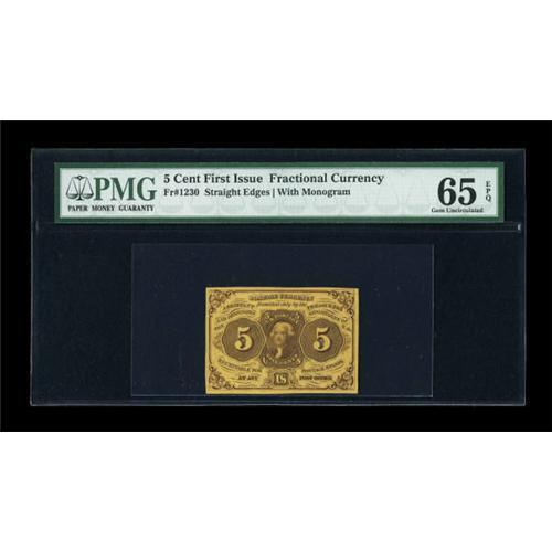 <B>Fr. 1230 5c First Issue PMG Gem Uncirculated 65 EPQ.</B></I> This most pleasing piece boasts ample face margins with well centered design. A bright and original note.<BR><BR><b>Shipping:</b> Coins & Currency (<a target="_blank" href="http://www.heritageauctions.com/common/shipping.php">view shipping information</a>)