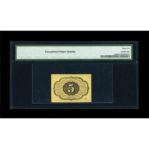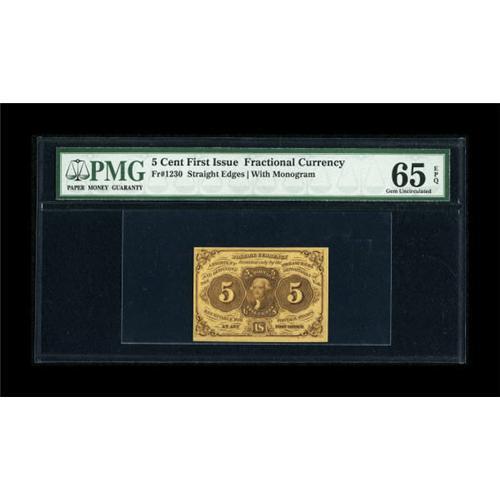 <B>Fr. 1230 5c First Issue PMG Gem Uncirculated 65 EPQ.</B></I> A delightful example of this first issue type that has superb ink colors and strikingly original paper.<BR><BR><b>Shipping:</b> Coins & Currency (<a target="_blank" href="http://www.heritageauctions.com/common/shipping.php">view shipping information</a>)