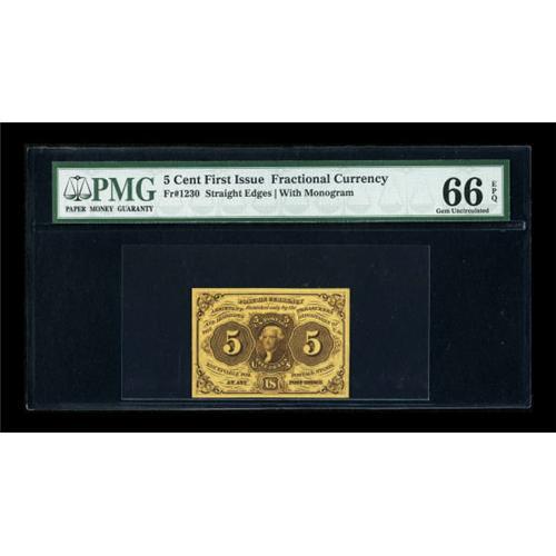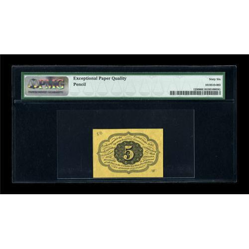 <B>Fr. 1230 5c First Issue PMG Gem Uncirculated 66 EPQ.</B></I> Perfectly equal face margins frame this bright and boldly printed First Issue piece. On back is a penciled "5B", likely a catalog number from an old time collector.<BR><BR><b>Shipping:</b> Coins & Currency (<a target="_blank" href="http://www.heritageauctions.com/common/shipping.php">view shipping information</a>)