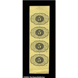Fr. 1230 5c First Issue Vertical Strip of Four Very Choice New. Four near-Gem examples with bright colors and the full wide sheet margins at the top and bottom. <BR><BR><B>Important notice:</B> Heritage usually auctions material at the rate of 200-250 lots per hour. On some occasions eBay Live bid software or the Internet may not be able to keep up with the pace of the auction. We recommend placing a realistic absentee bid now as insurance to avoid disappointment. Occasionally the auctioneer may eliminate or reject an eBay Live bid, and the auctioneer may also reopen a lot after the close of the eBay live bidding (usually because we missed an audience bid), and may reject your bid even if it shows you as the winning bidder. By bidding via eBay Live, you agree that Heritage may award the lot to another bidder at its sole discretion under the circumstances described above or any other reasonable circumstances. Since eBay bids are not shown to us until we open the lot on the floor, we treat those bids just like floor bids. In most cases the floor responds before the eBay bid is presented to us, due to Internet lag time, so for consistency we have made it a policy that floor bids are always considered first over tie eBay live bids. Also please note that all Heritage lots purchased through eBay Live carry a 20% Buyer's Premium. Please make sure you read the Terms and Conditions before you bid. <BR><BR><B>IMPORTANT ANNOUNCEMENT ABOUT RESERVES:</B> Heritage now divulges all reserves on its web site 7 days before every auction. If you want to know whether the reserve on this lot has been met, and if not, what the reserve amount is, please visit this lot page on the HeritageCoin.com web site, or email: bid@HeritageGalleries.com