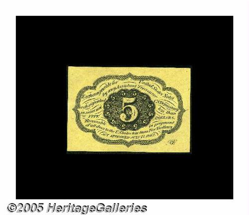 <B>Fr. 1230 Milton 1R5.4b 5¢ First Issue Superb Gem New.</B></I> Hugely margined, with strictly original paper surfaces, ideal centering of both sides and all the features that are needed for the ultimate grade. This is the variety printed with red-brown ink on yellow paper. A simply pristine example of the most common First Issue note. An ideal addition for a Gem Type Set.