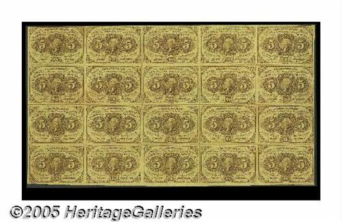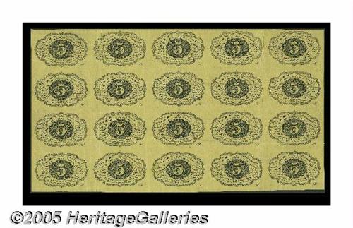 <B>Fr. 1230 Milton 1R5.4f 5¢ First Issue Full Sheet of Twenty Extremely Fine.</B></I> The wide margins have been cut down to normal note size and the sheet has a number of light folds. All the notes are bright. It's likely that this sheet circulated briefly as a very large one dollar bill.