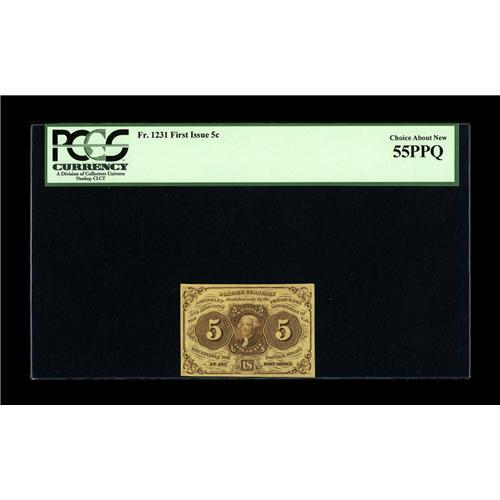 <B>Fr. 1231 5¢ First Issue PCGS Choice About New 55PPQ.</B></I> Well margined and beautifully bright. A very tough number to find with this exceptional appearence.<BR><I>From The Bill and Kathy Stella Currency Collection</B></I><BR><BR><b>Shipping:</b> Coin/Currency (<a target="_blank" href="http://www.heritageauctions.com/common/shipping.php">view shipping information</a>)