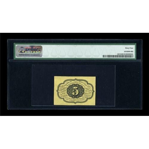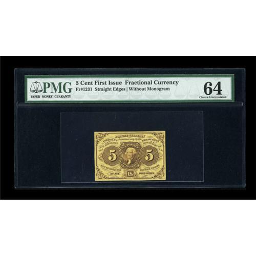 <B>Fr. 1231 5c First Issue PMG Choice Uncirculated 64.</B></I> The margins on this issue are sufficient for a Gem grade. <BR><BR><b>Shipping:</b> Coins & Currency (<a target="_blank" href="http://www.heritageauctions.com/common/shipping.php">view shipping information</a>)