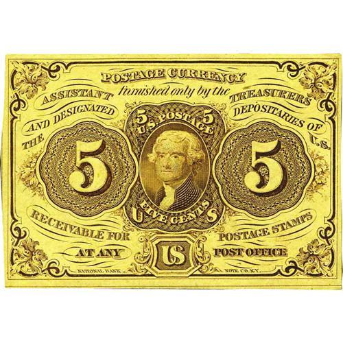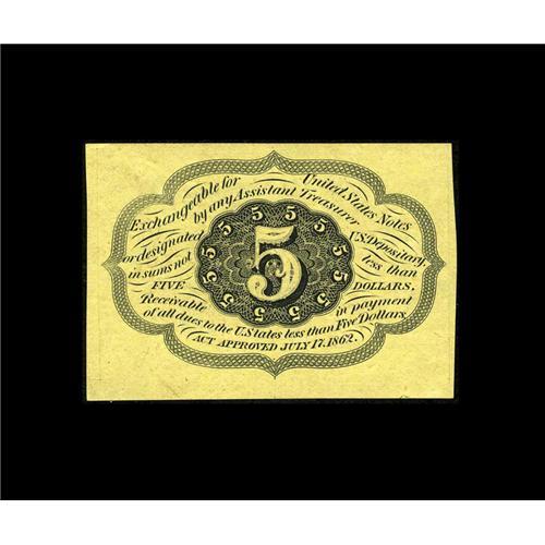 <B>Fr. 1231 5c First Issue Very Choice New.</B></I> This note is close to the full Gem grade, and this is the scarcest of the four Five Cent Postage Currency Friedberg numbers.