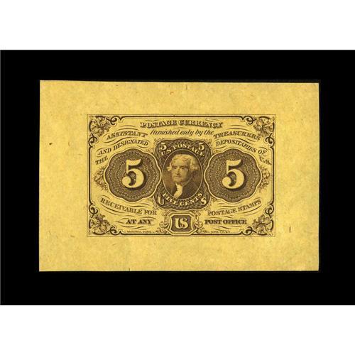 <B>Fr. 1231SP 5¢ First Issue Wide Margin Face Superb Gem New.</B></I> An absolutely perfect example, with huge margins, fresh paper surfaces, ideal originality and not so much as a handling mark. Very rarely seen this nice.<BR><I>From The Jacob and Heather Dedman Collection</B></I><BR><BR><b>Shipping:</b> Coins & Currency (<a target="_blank" href="http://www.heritageauctions.com/common/shipping.php">view shipping information</a>)