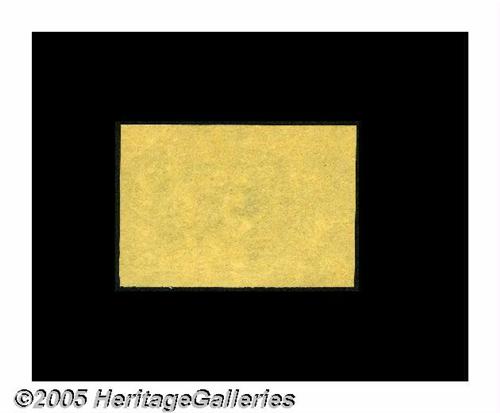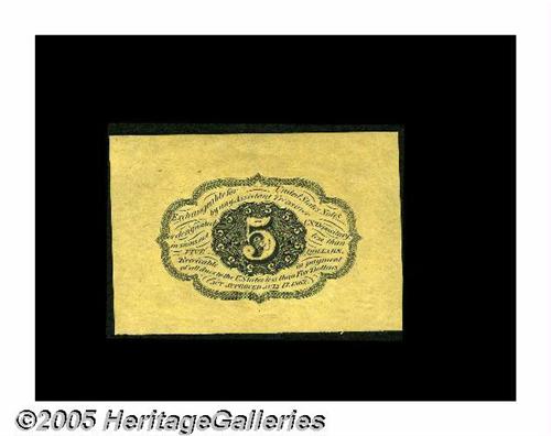 <B>Fr. 1231SP 5¢ First Issue Wide Margin Face Superb Gem New.</B></I> Milton 1P5R.1d. This and the next lot are very rare examples of the no-frameline First Issue backs. All normal Wide Margin First Issue Specimen backs have a thin but bold black frame line that surrounds the engraving at about the distance where the edges of a Regular Issue note would be. This and the next lot lack that frame line, but they are identical in all other respects to normal Wide Margin specimens. An unproven but generally accepted theory is that these were produced for Treasury specimen books but were not used. The 25¢ note that appears in these books also lacks the frame line but has the "ABNCo." monogram, which these notes lack. The Liechty Collection, which we sold in January of 1994, contained an example of all three known denominations (no 25¢ is known). Milt had only this 5¢ in his collection. The Liechty piece, which was identical to this, realized $962 in 1994.