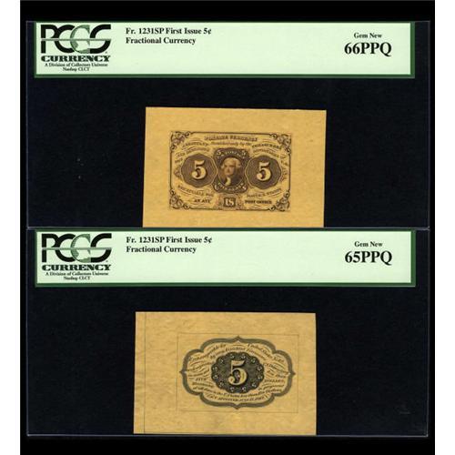 <B>Fr. 1231SP 5¢ First Issue Wide Margin Pair PCGS Gem New 66PPQ Face and 65PPQ Back.</B></I> A lovely high-end First Issue Wide Margin pair.<BR><BR><b>Shipping:</b> Coins & Currency (<a target="_blank" href="http://www.heritageauctions.com/common/shipping.php">view shipping information</a>)