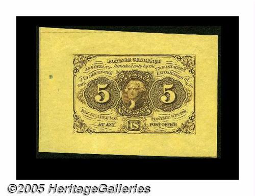 <B>Fr. 1231SP 5¢ First Issue Wide Margin Pair Superb Gem New.</B></I> Milton 1P5F.1c, 1P5R.1b. A gorgeous pair with beautifully wide margins, ideal paper surfaces and interesting paper quality, with both the face and back having a large number of as-made chips, inclusions, etc. The back shows three full cutting guides, and the face has one full cutting guide and two partials. Super quality.