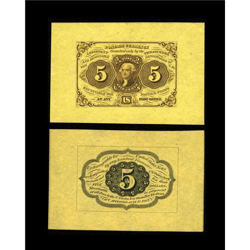 <B>Fr. 1231SP 5c First Issue Wide Margin Pair. Choice New.</B></I> This is a very difficult pair to grade as the face is an enormously margined and crisp superb gem note with the back giving the same appearance as the face but with a minor cornerfold that must be mentioned for accuracy's sake. Based upon the eye appeal of both pieces you can expect an exceptional price for the pair.<BR><BR><b>Shipping:</b> Coin/Currency (<a target="_blank" href="http://www.heritageauctions.com/common/shipping.php">view shipping information</a>)