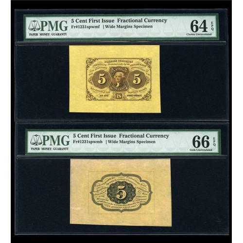<B>Fr. 1231SP 5c First Issue Wide Margin Pair PMG Gem Uncirculated 66 EPQ & PMG Choice Uncirculated 64 EPQ.</B></I> This is a lovely high end Wide Margin Pair. Although different in color, they are nicely matched. The framelines of the back specimen are almost completely visible.<BR><BR><b>Shipping:</b> Coins & Currency (<a target="_blank" href="http://www.heritageauctions.com/common/shipping.php">view shipping information</a>)