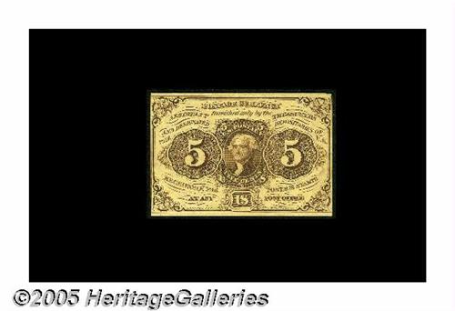 <B>Fr. 1231SP Milton 1S5F.1 5¢ First Issue Narrow Margin Face Choice About New.</B></I> A single corner fold away from the Gem grade.