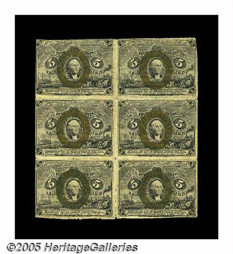 <B>Fr. 1232 5¢ Second Issue Block of Six Very Fine.</B></I> A 5¢ Second Issue block of six heavily folded between the notes with a partial separation in the vertical margin.