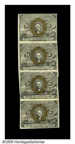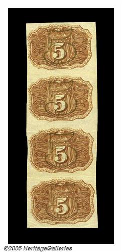 <B>Fr. 1232 5¢ Second Issue Vertical Strip of Four About New.</B></I> A nice Second Issue multiple with bright and well-centered bronze ovals adorning the face.
