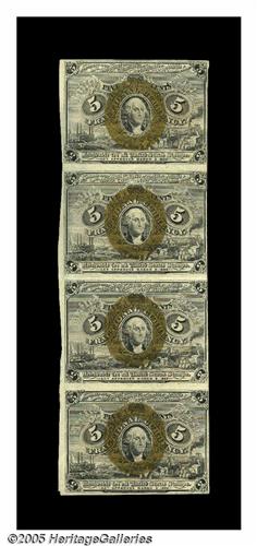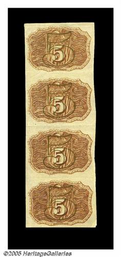 <B>Fr. 1232 5¢ Second Issue Vertical Strip of Four Extremely Fine.</B></I> Enhanced by nicely centered bright bronze ovals on the face of each note.