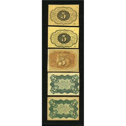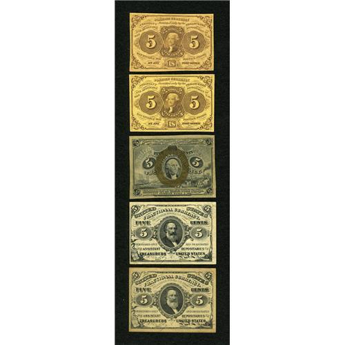 <B>Five Cent Fractionals.</B></I><BR> Fr. 1230 5c First Issue Two Examples <B>VF; XF<BR></B></I>Fr. 1232 5c Second Issue <B>About New, </B></I>tiny edge tear<BR>Fr. 1238 5c Third Issue Two Examples <B>VF, </B></I>aged; <B>XF.<BR></B></I><BR><BR><b>Shipping:</b> Coins & Currency (<a target="_blank" href="http://www.heritageauctions.com/common/shipping.php">view shipping information</a>)