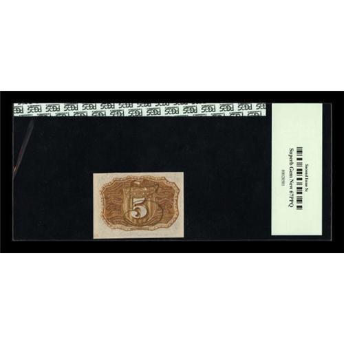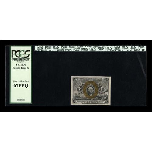 <B>Fr. 1232 5c Second Issue PCGS Superb Gem New 67PPQ.</B></I> From our 2006 Long Beach auction where the description read, "This is the highest third-party note we have handled for this Friedberg number. The face margins are especially wide with all four being at least 2mm. The back also reveals back plate number 178." It remains the nicest we have offered.<BR><BR><b>Shipping:</b> Coins & Currency (<a target="_blank" href="http://www.heritageauctions.com/common/shipping.php">view shipping information</a>)