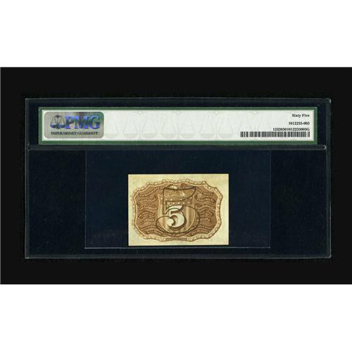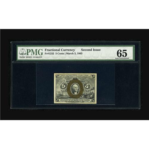 <B>Fr. 1232 5c Second Issue PMG Gem Uncirculated 65.</B></I> A well margined gem of this second issue type that has bright bronzing and perfect overprint centering.<BR><BR><b>Shipping:</b> Coin/Currency (<a target="_blank" href="http://www.heritageauctions.com/common/shipping.php">view shipping information</a>)