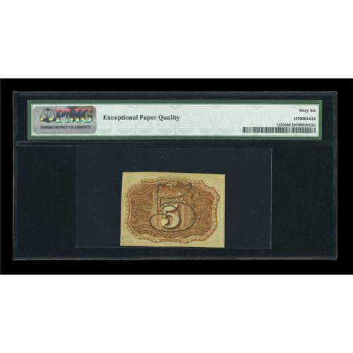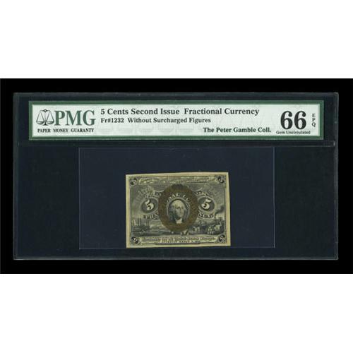 <B>Fr. 1232 5c Second Issue PMG Gem Uncirculated 66 EPQ.</B></I> Although the centering is less than perfect, the margins are primarily large, and the colors and print quality qualify this pretty little note as a Gem.<BR><I>From The Peter Gamble Collection.</B></I><BR><BR><b>Shipping:</b> Coins & Currency (<a target="_blank" href="http://www.heritageauctions.com/common/shipping.php">view shipping information</a>)