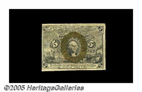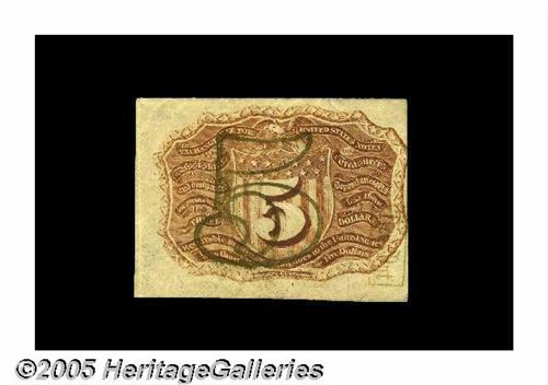 <B>Fr. 1232 5c Second Issue Treasury Rectangle About New.</B></I> A spectacular Treasury Rectangle note with the entire rectangle and every letter of "Tres Dpt." clear and bold. It's one of the nicest examples of the Treasury Rectangle notes that we have seen. There are two different accounts of the original of these Treasury Rectangles. Milt Friedberg has located a document from the Third Session of the Fortieth Congress, where in testimony a Mr. William Coleman testified that he and a Mr. Drummer counted the blank banknote paper before it was printed, and stamped it with a little stamp consisting of a rectangle with "Treas Dpt." inscribed on it. This rectangle was stamped on the corner of the sheet to indicate that it had been counted. A second version relies on the research of Martin Gengerke. That version is that Congress, having become concerned with counterfeiting, ordered the Treasury department to print notes on distinctive paper. The Treasury Department circumvented Congress's orders by stamping each sheet "Treas Dpt.," thereby making the regular banknote paper distinctive, instead of having to go back to the drawing board and print Experimental notes on various forms of paper, a process which had already been done, and during which Treasury Department officials never found a satisfactory substitute for the regular banknote paper. Several different sizes and shapes of Treasury Department rectangles are known, and it's possible, perhaps even likely, that both of these accounts are correct. In either case, the rectangle was at the very edge sheet, and it was intended to be trimmed off, accounting for their extreme rarity. We've handled most all of the known Treasury Rectangle pieces and this one is in the top three for clarity and completeness of the rectangle. An extremely important piece.