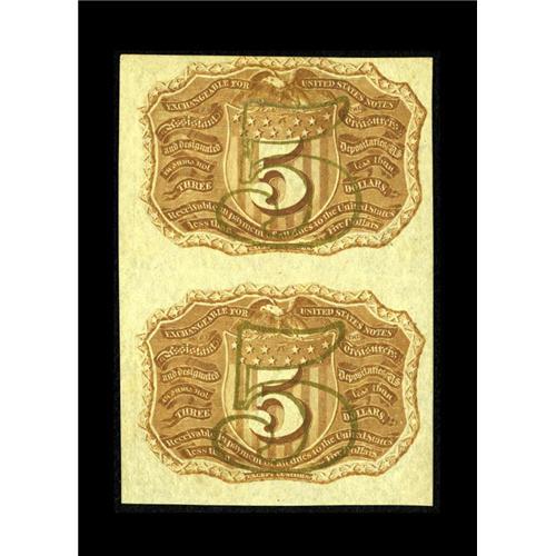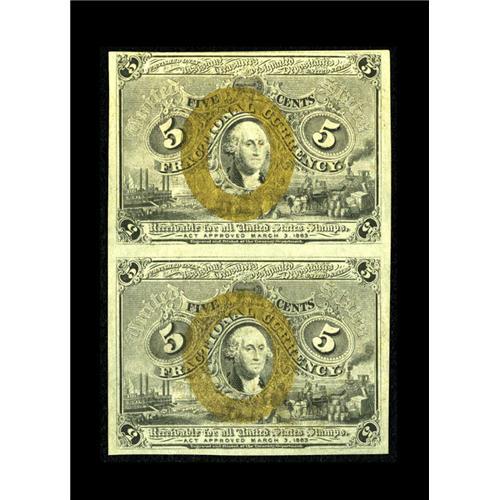 <B>Fr. 1232 5c Second Issue Vertical Pair About New.</B></I> The bronze overprint is reflective on this attractive vertical pair. There is a weak fold between the notes and a long corner fold.<BR><BR><b>Shipping:</b> Coins & Currency (<a target="_blank" href="http://www.heritageauctions.com/common/shipping.php">view shipping information</a>)