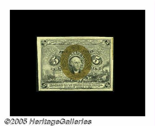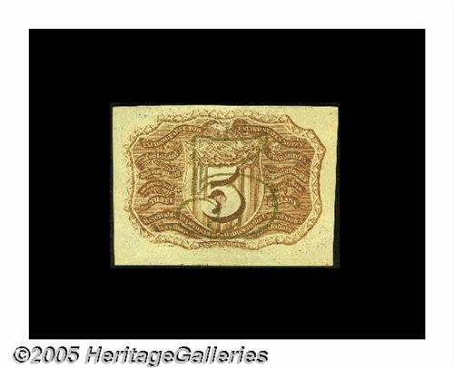 <B>Fr. 1232 Milton 2R5.1f 5¢ Second Issue Treasury Rectangle Gem New.</B></I> Incredible grade for a Treasury Rectangle note. The right-hand face margin contains the bottom line of the box but none of the letters.