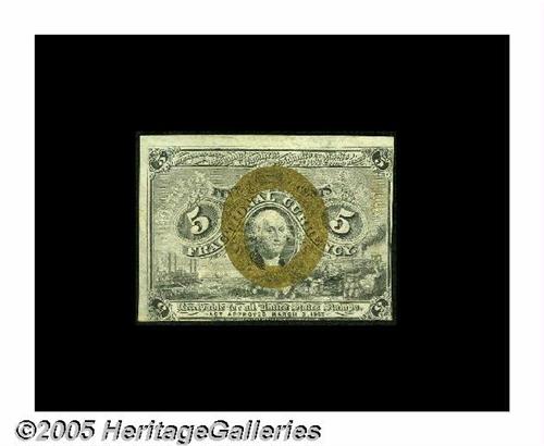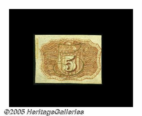 <B>Fr. 1232 Milton 2R5.1i 5¢ Second Issue Treasury Rectangle Choice New.</B></I> Treasury Rectangles have been an important item in Fractional Currency collecting ever since they were first noticed by collectors, which was shortly after the end of the circulating period. There are two different accounts of the original of these Treasury Rectangles. Milt Friedberg has located a document from the Third Session of the Fortieth Congress, where in testimony a Mr. William Coleman testified that he and a Mr. Drummer counted the blank banknote paper before it was printed and stamped it with a little stamp consisting of a rectangle with "Treas Dpt.," inscribed on it. This rectangle was stamped on the corner of the sheet to indicate that it had been counted. A second version relies on the research of Martin Gengerke. That version is that Congress, having become concerned with counterfeiting, ordered the Treasury Department to print notes on distinctive paper. The Treasury Department circumvented Congress's orders by stamping each sheet "Treas Dpt.," thereby making the regular banknote paper distinctive, instead of having to go back to the drawing board and print Experimental notes on various forms of paper, a process which had already been done, and during which Treasury Department officials never found a satisfactory substitute for the regular banknote paper. Several different sizes and shapes of Treasury Department rectangles are known, and it's possible, perhaps even likely, that both of these accounts are correct. In either case, the rectangle was at the very edge sheet, and it was intended to be trimmed off, accounting for their extreme rarity.<BR><BR> The Five Cent denomination is the second scarcest on which to find these Treasury Department bronze rectangles. On this note, it is located at the upper-left corner of the back. About half the rectangle appears along with the bottoms of all the letters. What is present is bold and bright. At the time of issue of Milt Friedberg's massive Encyclopedia of Fractional Currency, no Five Cent Treasury Rectangle had been discovered. Currently, there are about fifteen 25¢ notes, ten 10¢ notes, six 5¢ notes and to our best knowledge no 50¢ is known. This is a beautiful note that is a pure Gem save for its centering.