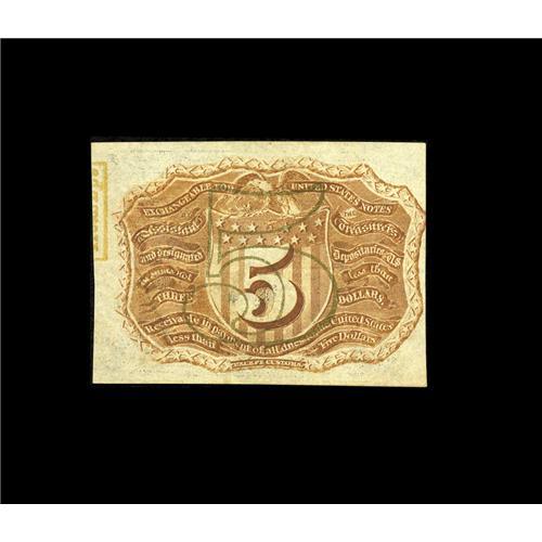 <B>Fr. 1232 Milton 2R5.1i 5¢ Second Issue Treasury Rectangle Choice New.</B></I> Treasury Rectangles have been an important item in Fractional Currency collecting ever since they were first noticed by collectors, which was shortly after the end of the circulating period. There are two different accounts of the original of these Treasury Rectangles. Milt Friedberg has located a document from the Third Session of the Fortieth Congress, where in testimony a Mr. William Coleman testified that he and a Mr. Drummer counted the blank banknote paper before it was printed and stamped it with a little stamp consisting of a rectangle with "Treas Dpt.," inscribed on it. This rectangle was stamped on the corner of the sheet to indicate that it had been counted. A second version relies on the research of Martin Gengerke. That version is that Congress, having become concerned with counterfeiting, ordered the Treasury Department to print notes on distinctive paper. The Treasury Department circumvented Congress's orders by stamping each sheet "Treas Dpt.," thereby making the regular banknote paper distinctive, instead of having to go back to the drawing board and print Experimental notes on various forms of paper, a process which had already been done, and during which Treasury Department officials never found a satisfactory substitute for the regular banknote paper. Several different sizes and shapes of Treasury Department rectangles are known, and it's possible, perhaps even likely, that both of these accounts are correct. In either case, the rectangle was at the very edge sheet, and it was intended to be trimmed off, accounting for their extreme rarity. The Five Cent denomination is the second scarcest on which to find these Treasury Department bronze rectangles. On this note, it is located at the upper-left corner of the back. About half the rectangle appears along with the bottoms of all the letters. What is present is bold and bright. At the time of issue of Milt Friedberg's massive Encyclopedia of Fractional Currency, no Five Cent Treasury Rectangle had been discovered. Currently, there are about fifteen 25¢ notes, ten 10¢ notes, six 5¢ notes and to our best knowledge no 50¢ is known. This is a beautiful note that is a pure Gem save for its centering.