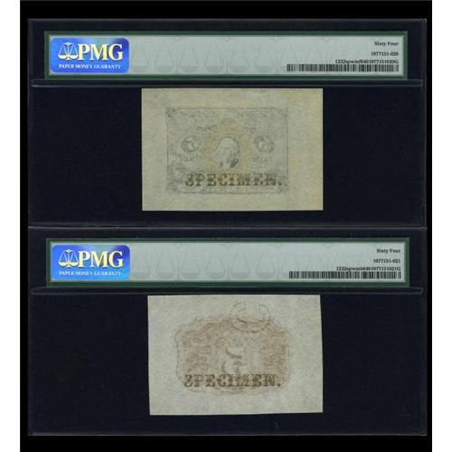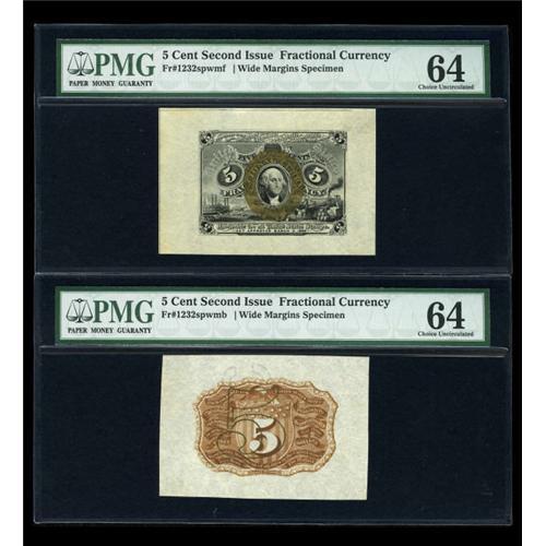 <B>Fr. 1232SP 5c Second Issue Wide Margin Pair PMG Choice Uncirculated 64.</B></I> This is about as evenly matched a pair as one could hope to obtain. The face displays the remnants of three framelines.<BR><BR><b>Shipping:</b> Coins & Currency (<a target="_blank" href="http://www.heritageauctions.com/common/shipping.php">view shipping information</a>)