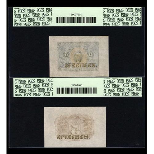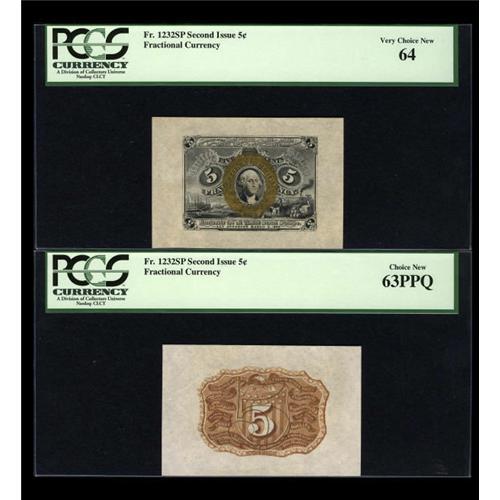 <B>Fr. 1232SP 5c Second Issue Wide Margin Pair PCGS Very Choice New 64 & PCGS Choice New 63PPQ.</B></I> The face has been cut down just a bit more than the back, but the colors are gorgeous on both pieces.<BR><BR><b>Shipping:</b> Coins & Currency (<a target="_blank" href="http://www.heritageauctions.com/common/shipping.php">view shipping information</a>)