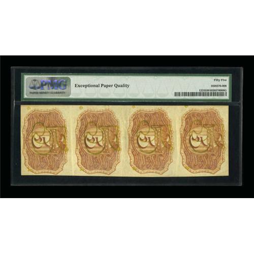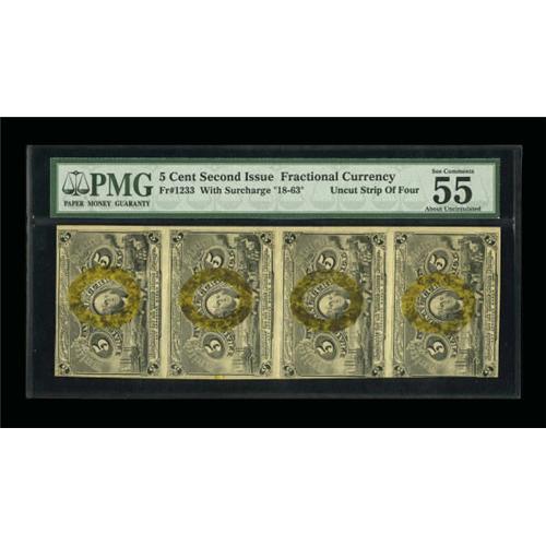 <B>Fr. 1233 5¢ Second Issue Vertical Strip Of Four PMG About Uncirculated 55 EPQ.</B></I> This attractive strip shows folds between the notes, but not through the designs.<BR><BR><b>Shipping:</b> Coins & Currency (<a target="_blank" href="http://www.heritageauctions.com/common/shipping.php">view shipping information</a>)