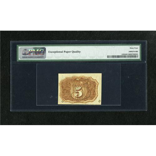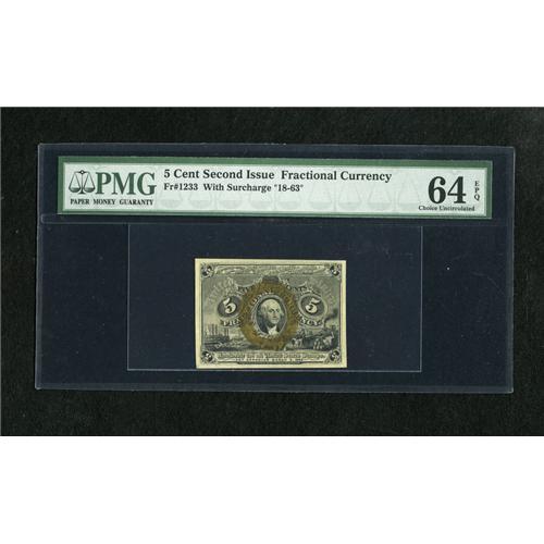 <B>Fr. 1233 5c Second Issue PMG Choice Uncirculated 64 EPQ.</B></I> This piece boasts solid margins and the 18-63 surcharge. The paper quality is most pleasing.<BR><BR><b>Shipping:</b> Coins & Currency (<a target="_blank" href="http://www.heritageauctions.com/common/shipping.php">view shipping information</a>)