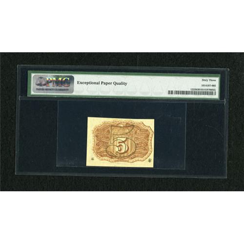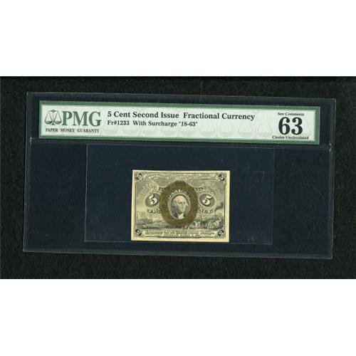 <B>Fr. 1233 5c Second Issue PMG Choice Uncirculated 63 EPQ.</B></I> Strong printing and good color are found on this slightly scarcer number.<BR><BR><b>Shipping:</b> Coins & Currency (<a target="_blank" href="http://www.heritageauctions.com/common/shipping.php">view shipping information</a>)
