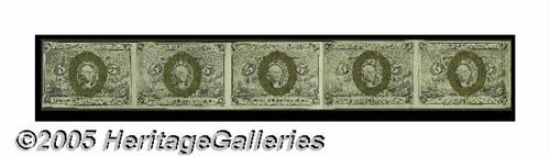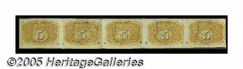 <B>Fr. 1233 5c Second Issue Uncut Strip of Five.</B></I> Each of the notes and the strip itself grade <B>Choice Extremely Fine.</B></I> It is unusually clean and bright for a Fractional multiple.