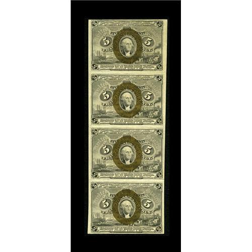 <B>Fr. 1233 5c Second Issue Vertical Strip of Four Choice New.</B></I> This nicely bronzed strip exhibits a fold between every note, but otherwise no other handling to report.<BR><BR><b>Shipping:</b> Coins & Currency (<a target="_blank" href="http://www.heritageauctions.com/common/shipping.php">view shipping information</a>)