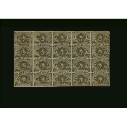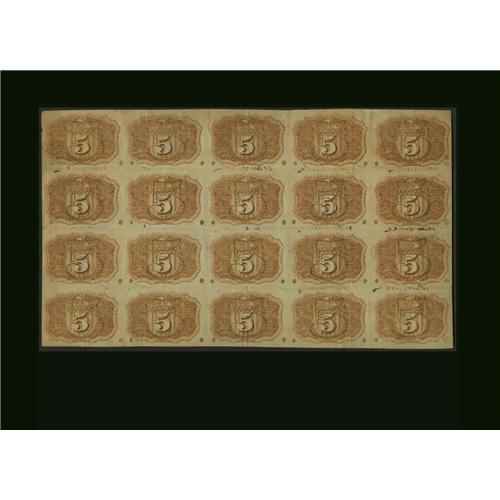 <B>Fr.1233 Milton 2R5.2g 5¢ Second Issue Full Sheet of 20 Courtesy Autographed Extremely Fine.</B></I> This unique courtesy-autographed sheet is signed by John Burke 15 times between the notes. This sheet earned the single largest photograph in Milt's Encyclopedia filling nearly half of page 43. There are a few light folds in the sheet causing the technical grade of Extremely Fine, but it is amazingly attractive. This would be the centerpiece of any exhibit of Courtesy Autographed Notes. John Burke was Treasurer of the United States between 1913 and 1921. It appears from the frequency of his courtesy autograph on Fractional Currency, that he signed an individual's entire collection. This sheet was from our sale of the Milt Friedberg Collection in January of 1997. It was estimated there at $1,500 up and realized just a hair over estimate at $1,540.