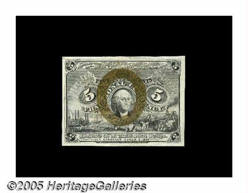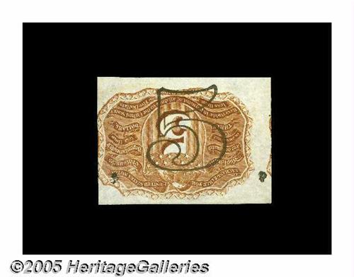 <B>Fr. 1233 Milton 2R5.2i 5¢ Second Issue Inverted Back Engraving Gem New.</B></I> A stunningly beautiful Fractional Invert, and an extraordinarily rare one to boot. This piece is unique. The face is magnificently margined, with brilliant paper colors and bright bronze. The back is every bit as pretty, but it is a bit off center to the left. Unique at the time of Tom's research several years ago, and it remains so to our best knowledge. An incredibly important Fractional Invert.
