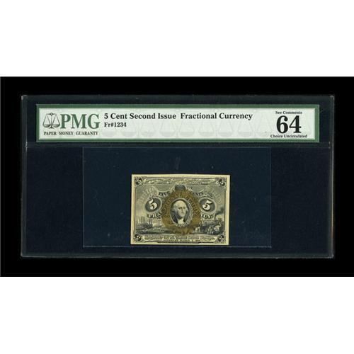 <B>Fr. 1234 5c Second Issue PMG Choice Uncirculated 64 EPQ.</B></I> A reflective bronze overprint and distinct surcharges are traits of this fractional. PMG reinforces this notion by stating "Exceptional Paper Quality" on its third-party label.<BR><BR><b>Shipping:</b> Coins & Currency (<a target="_blank" href="http://www.heritageauctions.com/common/shipping.php">view shipping information</a>)