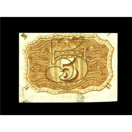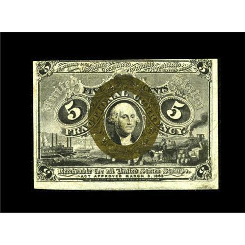 <B>Fr. 1235 5c Second Issue Choice About New.</B></I> The bronze oval has been placed neatly over the portrait on this note that has a small corner fold.<BR><BR><b>Shipping:</b> Coins & Currency (<a target="_blank" href="http://www.heritageauctions.com/common/shipping.php">view shipping information</a>)