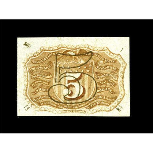 <B>Fr. 1235 5c Second Issue Choice New.</B></I> This is a Gem but for the centering. The bottom and right margins are huge, the top and left quite close, but free of the frame line. Except for these typical centering deficiencies, this is a gorgeous 5 Cent Fiber Paper note. This is a really tough number, not often seen anywhere near this nice.<BR><BR><b>Shipping:</b> Coin/Currency (<a target="_blank" href="http://www.heritageauctions.com/common/shipping.php">view shipping information</a>)