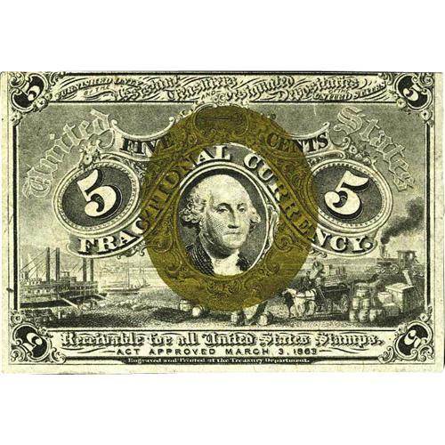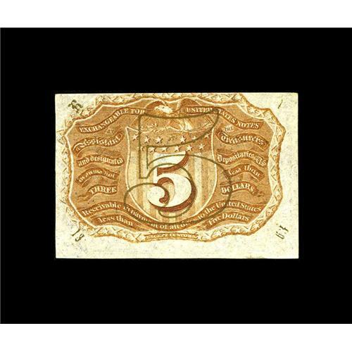 <B>Fr. 1235 5c Second Issue New.</B></I> This is an elusive fiber paper note with this example exhibiting distinct surcharges, reflective bronze, and a top edge along the frame line. Purchased by our consignor at the First International Paper Money Show in Memphis in 1977.