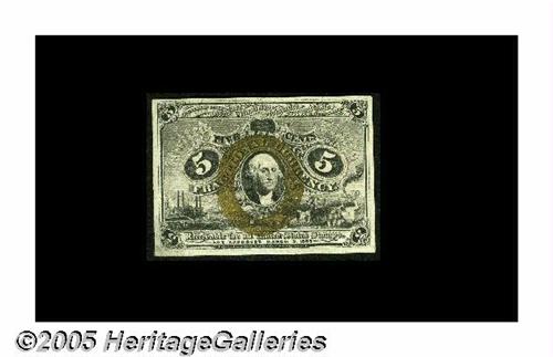 <B>Fr. 1235 Milton 2R5.5 5¢ Second Issue Very Choice New.</B></I> A near-Gem example of this rare and popular one-number type. Fr. 1235 is the only Five Cent Fiber Paper Fractional note. It's scarce in all grades, and very rare in Choice condition. This note would be a perfect Gem if the top margins, both face and back, were as large as the other three.