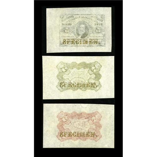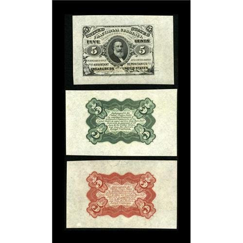 <B>Fr. 1236/38SP 5¢ Third Issue Wide Margin Set of Three Gem New.</B></I> The Face, as well as the Red and Green Backs, is beautifully wide and brightly colored. There has been tremendous buying pressure on Wide Margin Specimens of late, and we would not be at all surprised to see this lovely trio approach the four-figure mark.<BR><I>From The Jacob and Heather Dedman Collection</B></I><BR><BR><b>Shipping:</b> Coins & Currency (<a target="_blank" href="http://www.heritageauctions.com/common/shipping.php">view shipping information</a>)