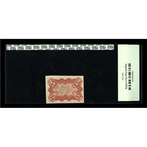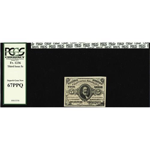 <B>Fr. 1236 5c Third Issue PCGS Superb Gem New 67PPQ.</B></I> Excellent centering of both sides, and not a trace of the normally seen ink-smears that plague this number. The note is strictly original and the colors are perfect.