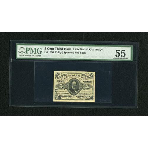 <B>Fr. 1236 5c Third Issue PMG About Uncirculated 55.</B></I> Huge margins and deep embossing are seen on this red back Clark note that has toned a shade.<BR><BR><b>Shipping:</b> Coins & Currency (<a target="_blank" href="http://www.heritageauctions.com/common/shipping.php">view shipping information</a>)