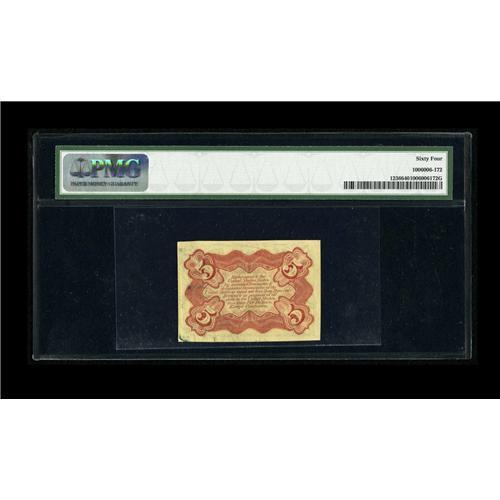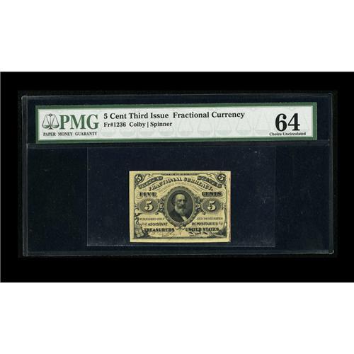 <B>Fr. 1236 5c Third Issue PMG Choice Uncirculated 64.</B></I> This is a very well margined red back Clark note which has good eye appeal for the grade and far less pressbed smearing than is typical for this number.